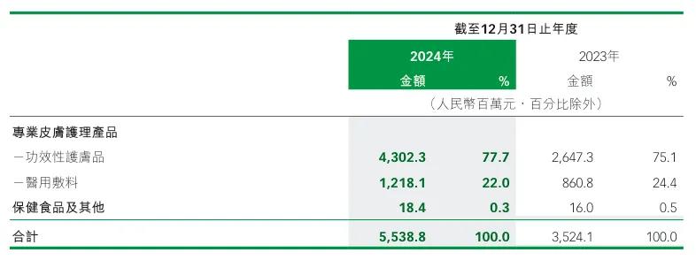 对比同为重组胶原蛋白赛道的玩家——巨子生物,其2024年度业绩公告,公司实现收入55.39亿元,同比增长57.2%,增速创5年新高;归母净利润20.62亿元,同比增长42.1%。在巨子生物年营收中,功效性护肤品总收入便达到了43.02亿。